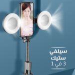 • 3 في 1 عصا سيلفي، حامل هاتف، وإضاءة مدمجة.