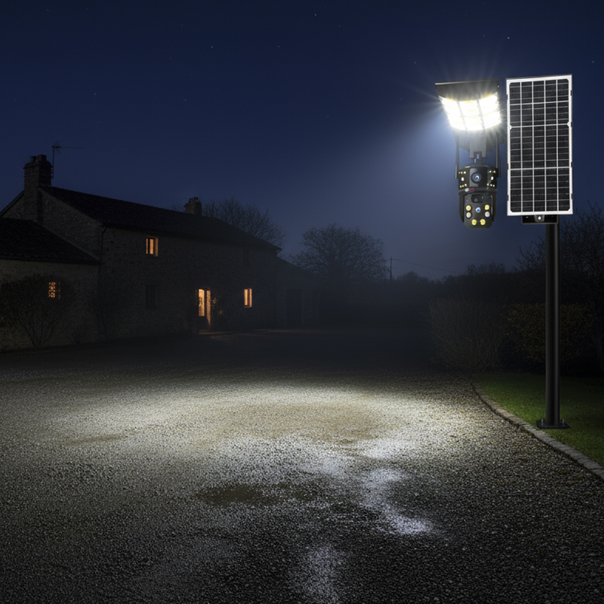 زاوية الإضاءة والمراقبة: كاميرا وضوء شارع بنفس الوقت تغطي وتنوّر المكان